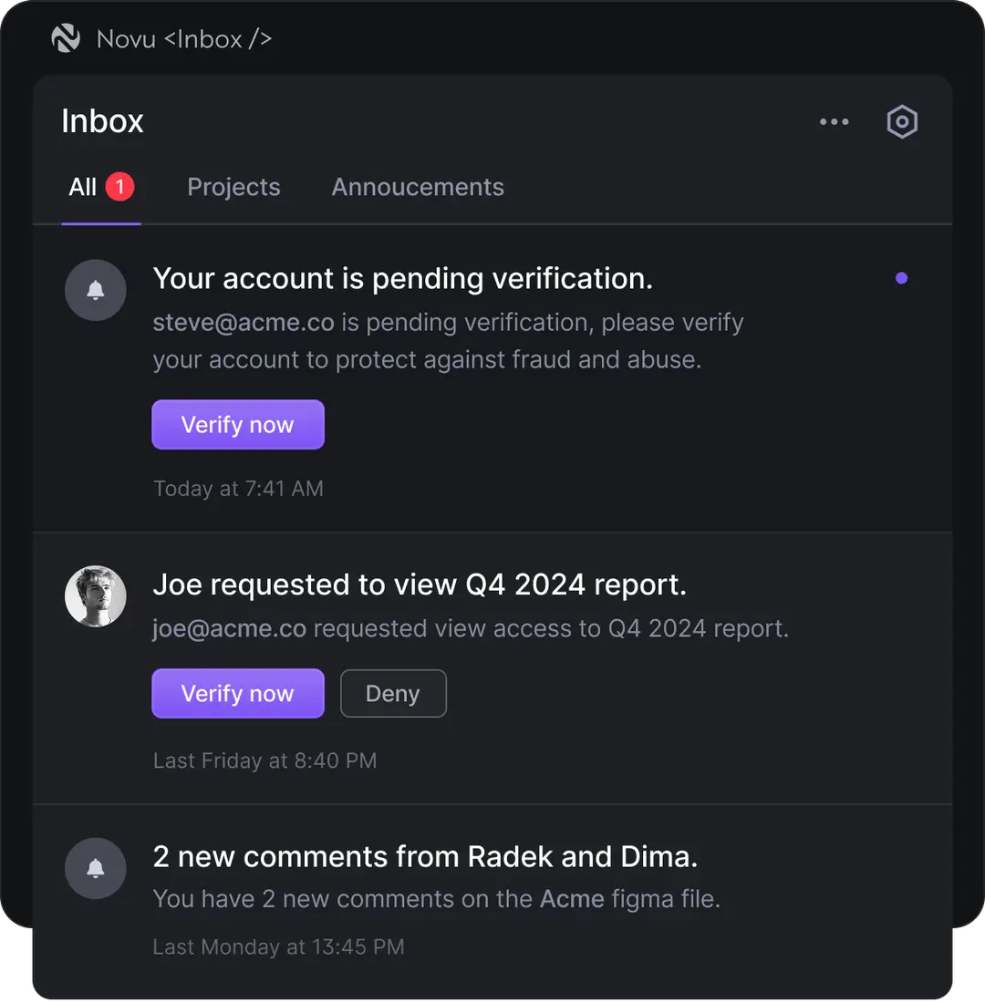 An open, opinionated platform that orchestrates the full notification lifecycle and unifies it into a programmable <Inbox /> experience you can ship fast and fully customize, giving builders complete control. We handle notification infrastructure so you can focus on building your product.